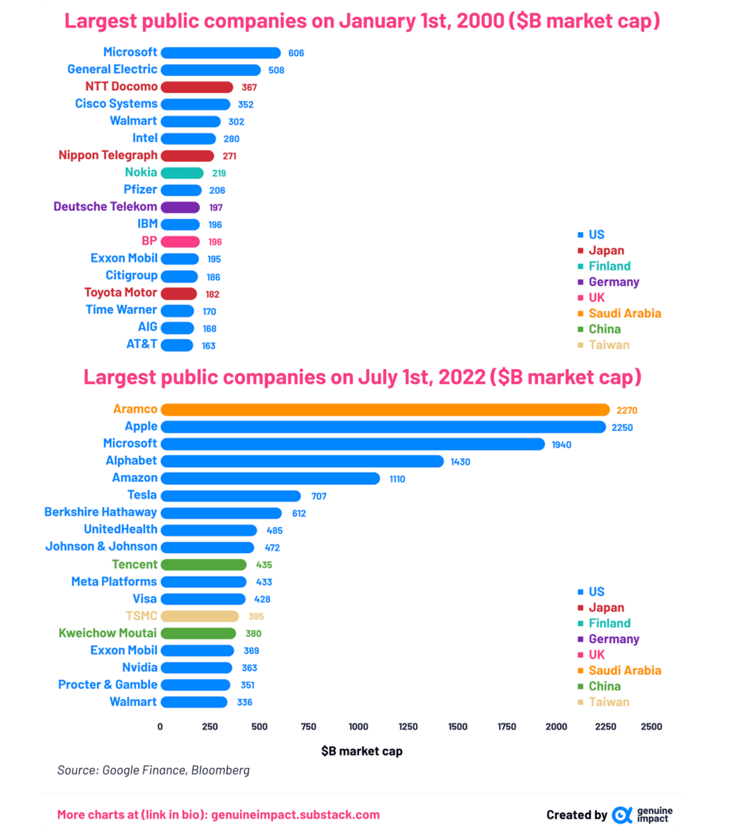 Here are some really interest graphics from Genuine Impact. The first looks at the biggest companies in the world from 2000, and the biggest companies now. Some huge names that didn't even exist back then, and some equally big names that have fallen from grace.
