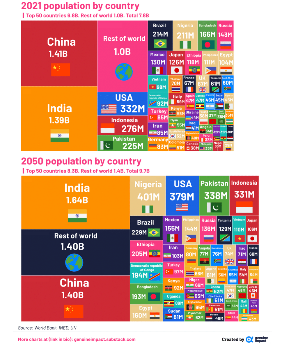 India is expected to be the world's most populous country by 2050. I'm not surprised at that. But look at Africa. Nigeria, Ethiopia, DRC, Kenya, Uganda, Mozambique, Ghana, Cameroon, Angola, Cote D'Ivoire, Morocco, Burkina Faso, Algeria, South Africa, Niger and Tanzania. 16 out of the top 50 are in Africa. That's crazy.